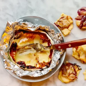 - Serveer de gebakken camembert uit de oven met de gekarameliseerde uien er bovenop. Dip met crackers voor het beste resultaat.