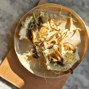 De paddenstoelen (een mooie mix van Sproomz) bak je snel om in een beetje olijfolie met knoflook en citroensap. Door verschillende soorten te gebruiken - kastanjechampignons, oesterzwammen, shiitake - krijg je diepte in smaak én structuur. Een extra pluspunt: dit gerecht is vegetarisch, voedzaam en klaar in minder dan 20 minuten.